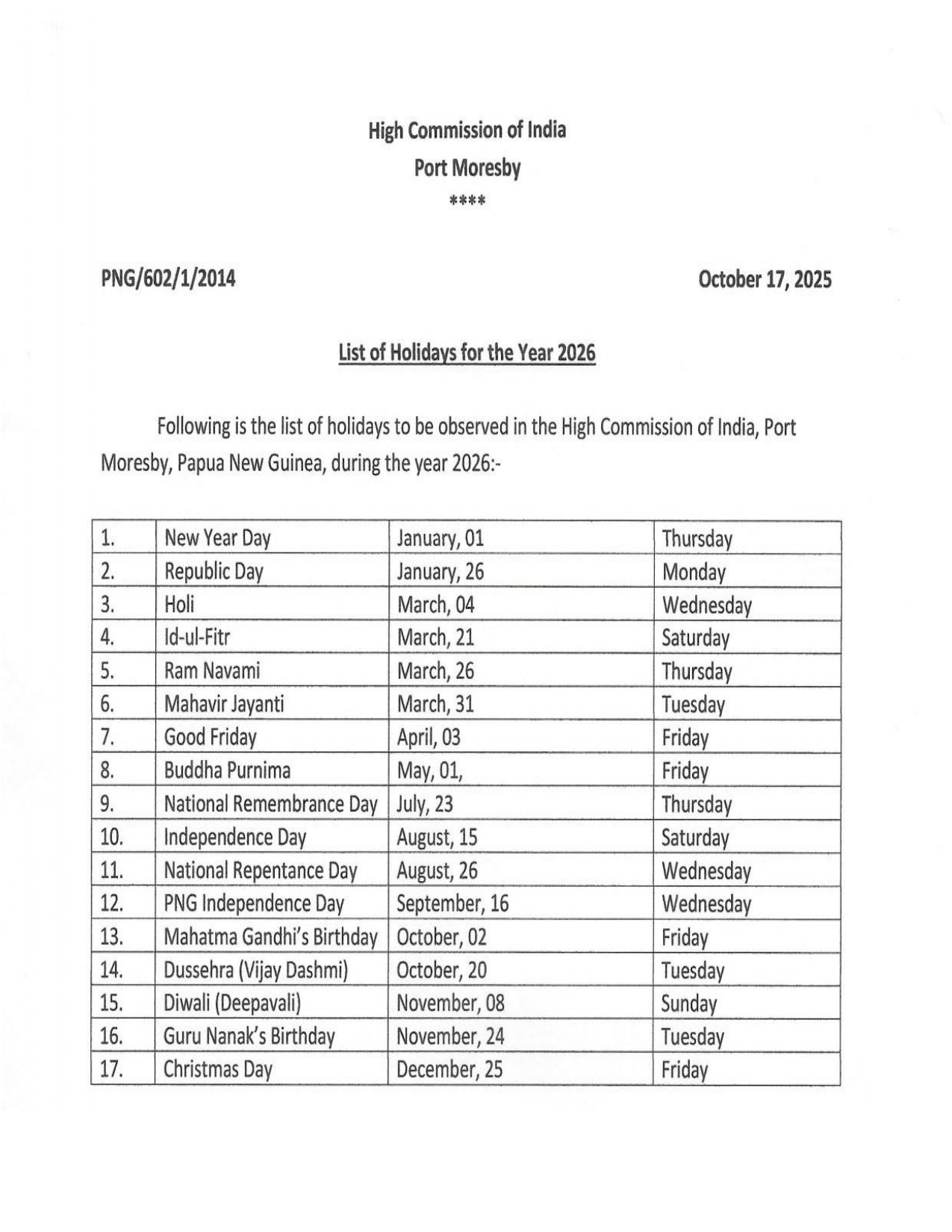 About Us List of Holidays - 2025/2026